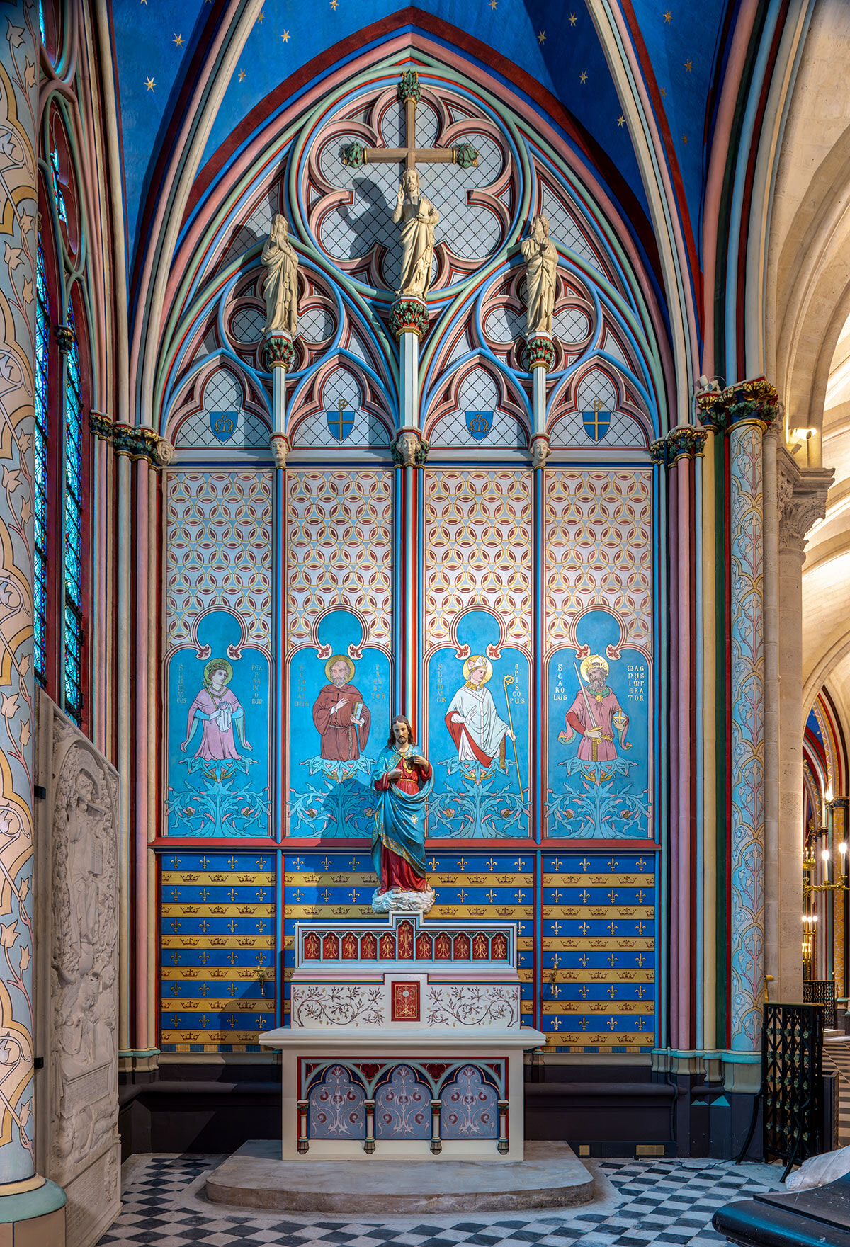 12世紀から14世紀にかけて建設されたゴシック様式の大聖堂は、フランス革命時に権力の象徴として破壊の対象となり、荒れ果てた。19世紀に入ってナポレオンの戴冠式が行われ、ヴィクトル・ユーゴーの小説『ノートルダムのせむし男』で一躍有名になった大聖堂は、1844年、建築家ウージェーヌ・ヴィオレ=ル=デュックの指揮で大改修される。ゴシック建築に特別な想いを寄せる彼は中世当時の技術に忠実であろうとし、中世のスタイルに一貫性を持たせるため、修復に留まることなく新たな彫刻を加えた。鮮やかなペイントを施して中世スタイルの内装を完成させ、フランス革命で破壊された尖塔を自らの意匠で再建した。