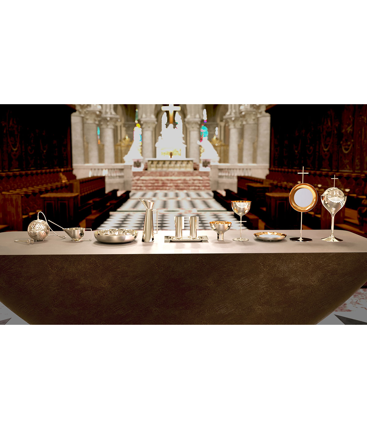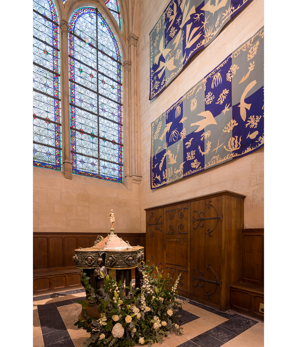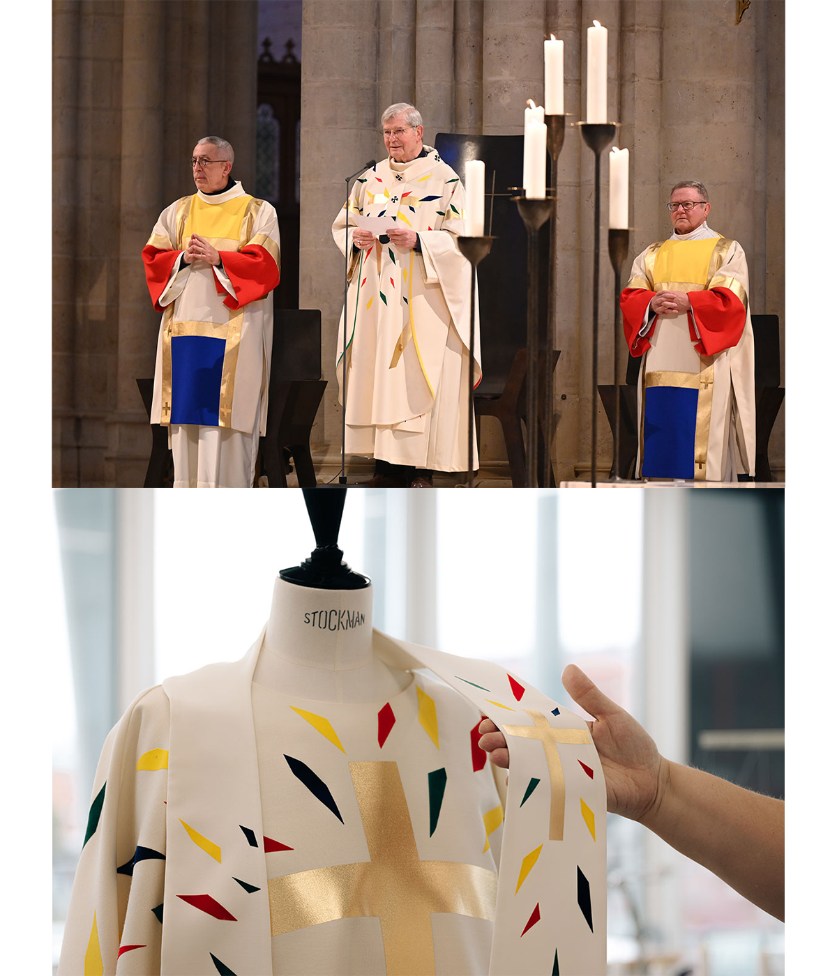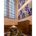 大火災を受けての今回の修復の目標は、この大改修時の姿を取り戻すことだったが、いくつかの現代クリエイションも時代の足跡を残している。大聖堂に入ってすぐ目に入る十字架を抱いたブロンズの洗礼盤、祭壇、司教座などの調度品や、重要なミサで聖職者が纏う祭服、信徒や見学者のための座席などが新たにクリエイトされた。北側の回廊に並ぶチャペルを飾るタペストリー、南側の回廊のためのステンドグラスもまた現代アーティストの採用が決まり、制作が進んでいる。