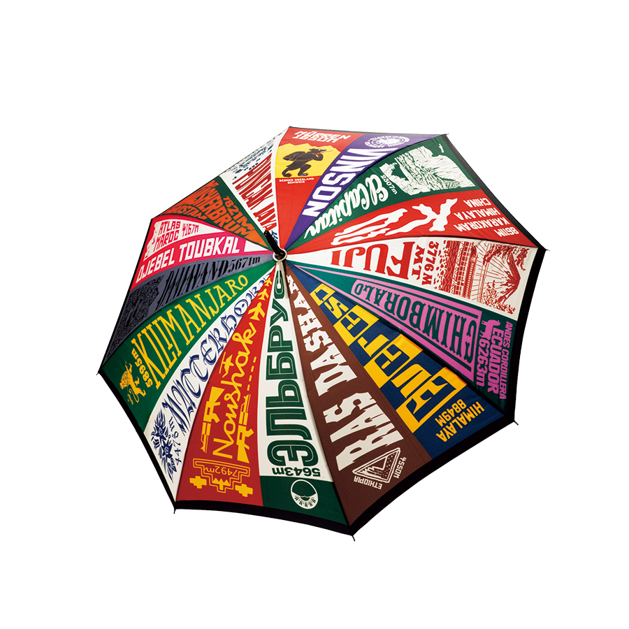 ホテル・ドライ・ベルゲのあるアルプスをはじめ、キリマンジャロ、富士山など世界の名峰の名前を鮮やかにデザイン。
