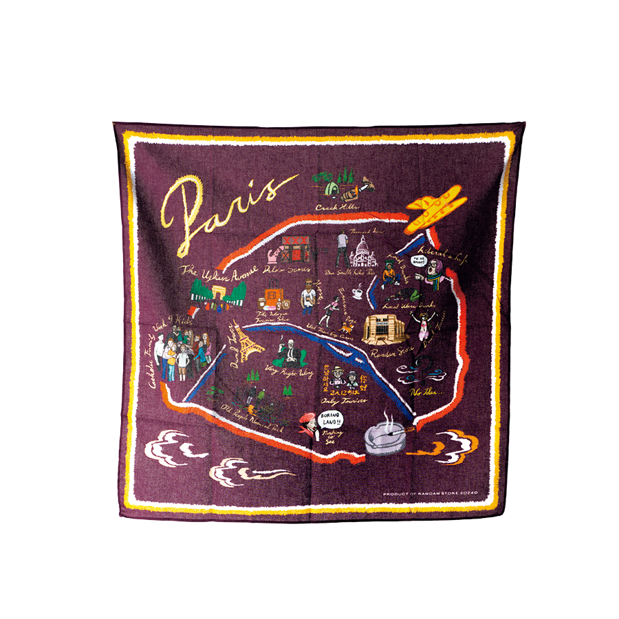 パリの地図に名所やフランスのシンボルが描かれたバンダナは、肌なじみの良いコットン素材。首や髪に巻いても、インテリアとして飾っても!