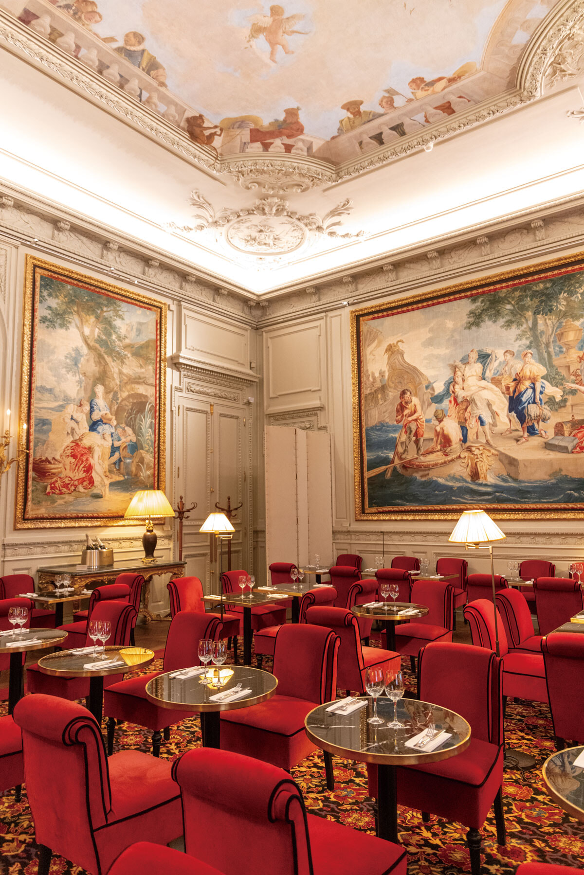 ティエポロの天井画に彩られたかつての食堂を生かしてティーサロンに。日替わりケーキやランチを楽しめる。