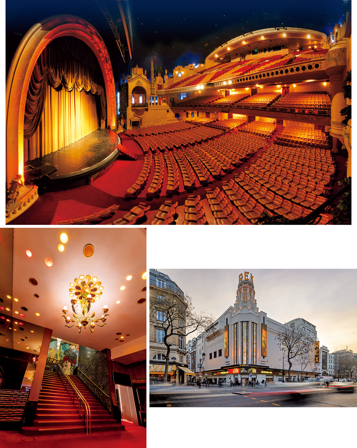 アールデコ風の外観(右下)と赤基調のアーチ型のレトロな内装(上)やロビー(左下)は、ニューヨークのラジオシティ・ミュージックホールが着想源。 ©Le Grand Rex
