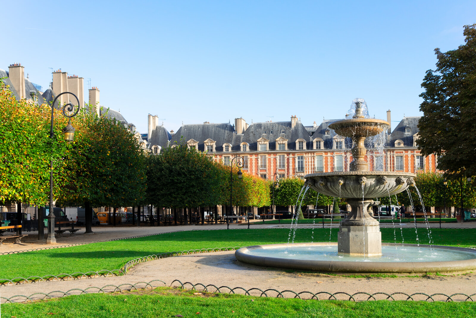 マレ地区にあるヴォージュ広場は、1612年に作られた最古の広場。宮廷の高官や貴族らが住んでいた36の赤レンガ造りの邸宅が広場を取り囲み、1階部分にあるアーケードには現在、素敵なカフェや画廊、美術館などが軒を連ねる。