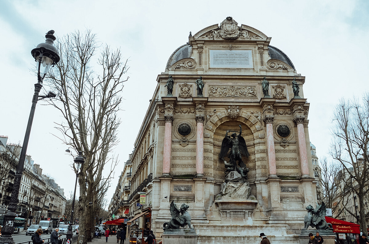 1855年につくられたサン・ミッシェル広場は、口から水を吹き出すドラゴンの巨大な噴水と、その背後に立つサン・ミッシェル(聖ミカエル)象をシンボルとする。カルチエ・ラタンの玄関口であり、パリジャンの定番の待ち合わせ場所として賑わいを見せる。