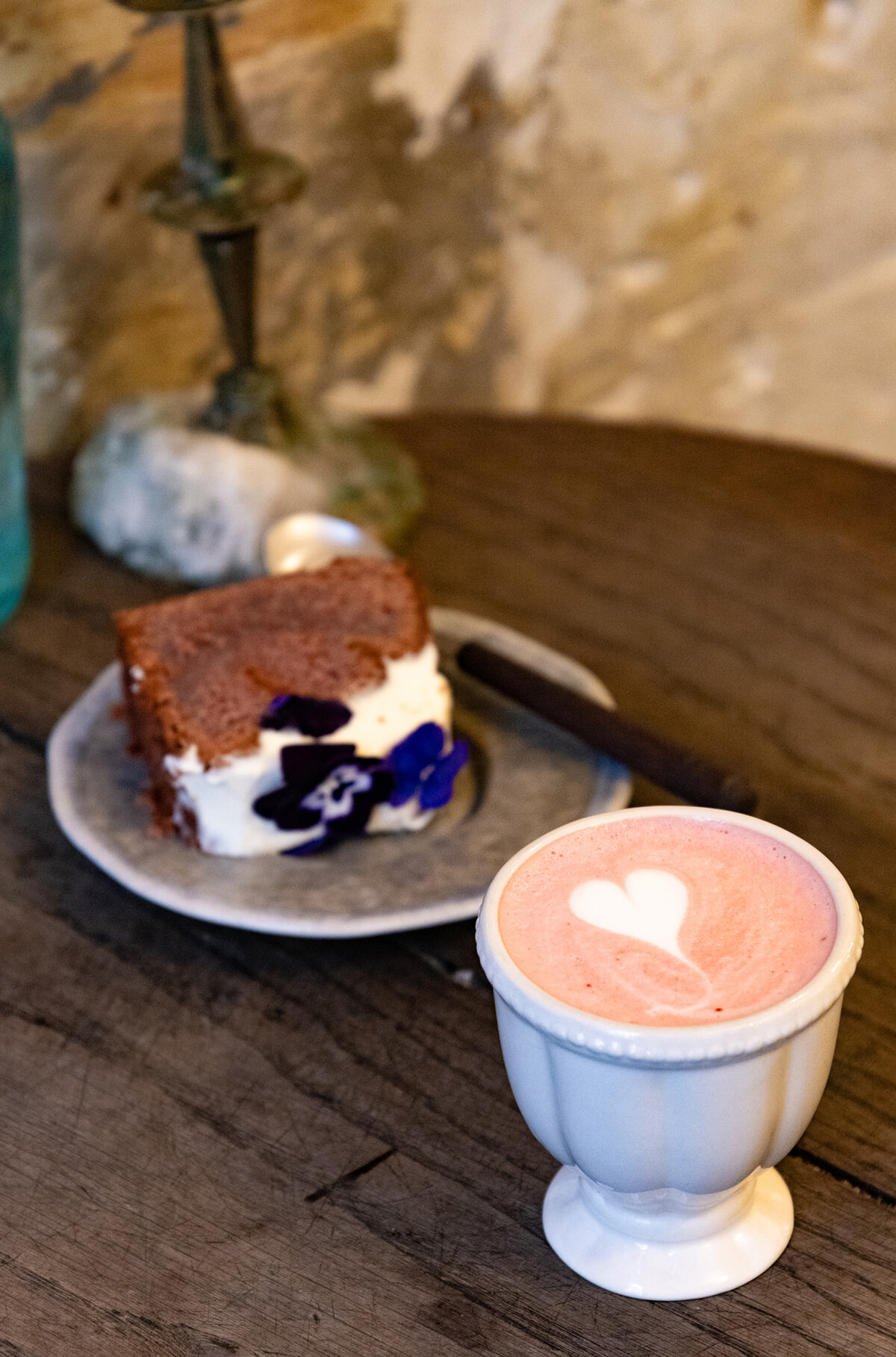 ビーツパウダーをミルクに混ぜたラテ「Latte Red Velvet」7ユーロ。奥は、しっとり焼き上げたバニラ入りチョコレートケーキにサワークリームをトッピングした「Velvet Heart」6.50ユーロ