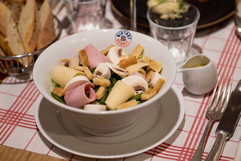 ハム、エメンタールチーズ、インゲン、シャンピニオン・ドゥ・パリ……何もかもが新鮮なサラダ・パリジェンヌ。12ユーロ。photo:Julien Mouffron-Gardner
