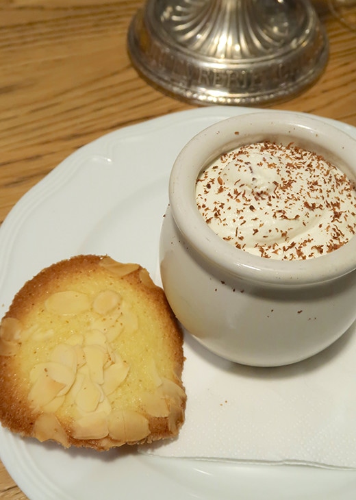 チョコレートとクリームのデザート。添えられたチュイルに至るまで美味! 9ユーロ。なお、31.5ユーロのセットは、前菜+メイン+グラスワインまたはハイネケン・ビールまたはミネラルウォーター、もしくはメイン+デサート+グラスワインまたはハイネケン・ビールまたはミネラルウォーター。キッズメニューは13ユーロ。