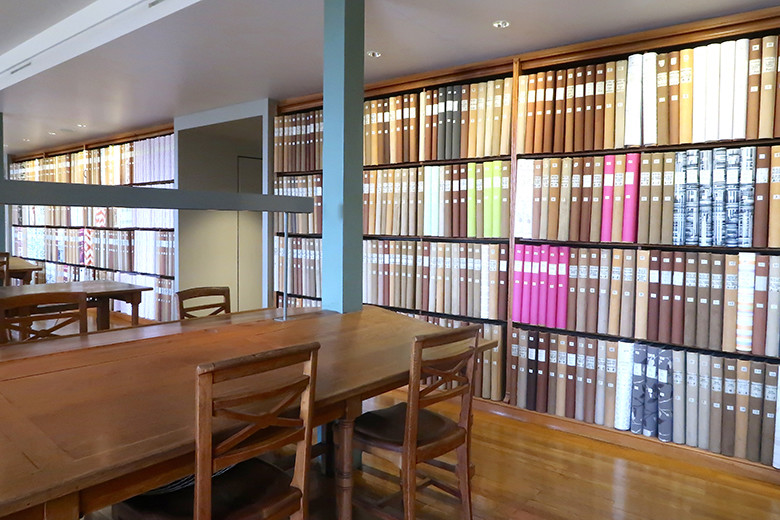 閲覧室。棚と棚の間、奥にモード、デザインなどテーマ別に分かれた書棚が並ぶ部屋がある。