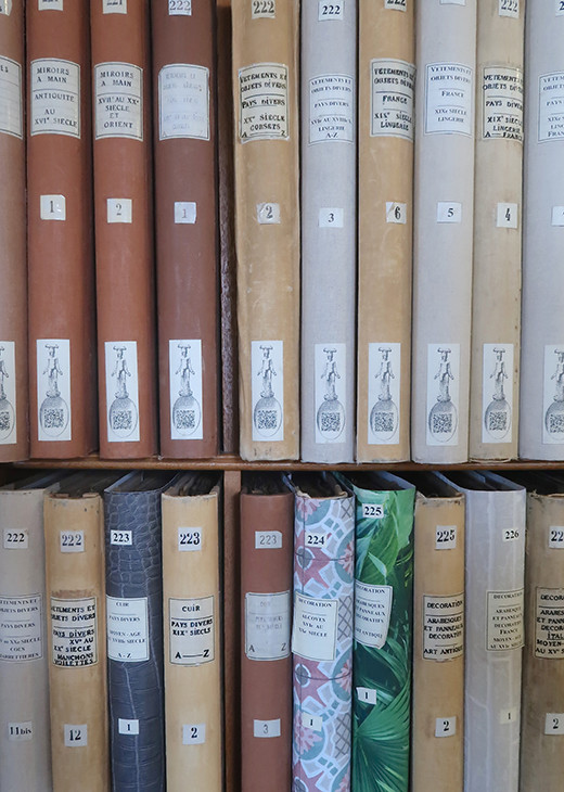 図書館に入るのは、展覧会を見る時とは別の入り口から。オンラインで所蔵本をチェックできるだけでなく、テーマ別の書棚から自由に本を手に取ることも。さらにチュイルリー公園に面して自然光が入る閲覧室で、周囲の棚に並ぶジュール・マシエ・コレクションを活用することができる。これはジュール・マシエ(1846〜1911)という豊かな年金暮らしの男性が情熱を傾けた、493のテーマからなるビジュアル辞典。そのアルバム数は約5,000冊で、テーマに合わせて写真や版画といったビジュアルを見つけ出して、切り抜き、貼り付けて……という作業を行っていた。職人やアーティストや製造業者たちにイメージソースを提供できるようにと、1885年から亡くなるまで彼自身で制作。彼の死後も意思を継いだ人によって続けられた。これらアルバムは、たとえば19世紀のヘアスタイルって? 1930年代のモードって? 20世紀初頭のレストランのメニューって? 果ては18世紀の拷問の道具って? といった興味に、ビジュアルでいまも答えてくれる貴重な資料なのである。