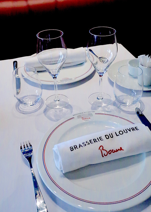 リヨンのポール・ボキューズとのコラボレーションによるブラッスリー・デュ・ルーヴル・ボキューズがホテル内に誕生したというのは、グルメファンにとっては大事件では? 偉大なるシェフは昨年亡くなってしまったが、このコラボレーションは彼の生前から進行していたプロジェクト。ポール・ボキューズのパリ初進出である。ブラッスリー・ボキューズで何が食べられるのかというと、カワカマスのクネル(31ユーロ)、ブレスの鶏(32ユーロ)、リヨン風マカロニグラタン(13ユーロ)といったボキューズならではの料理。もちろんデザートには、有名なおばあちゃん秘伝のゴーフル(12ユーロ)も。前菜にも、リヨン風オニオングラタンスープ(13ユーロ)やピスタチオのホットソーセージを詰めたブリオッシュ(14ユーロ)といった名物が並ぶ。