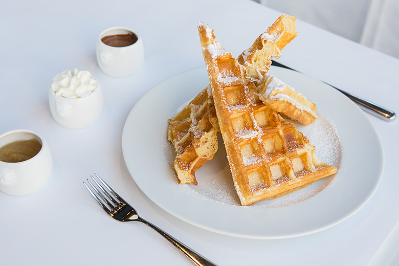チョコレートソース、クレーム・シャンティイ、フルーツのコンポートが添えられたゴーフル(12ユーロ)。