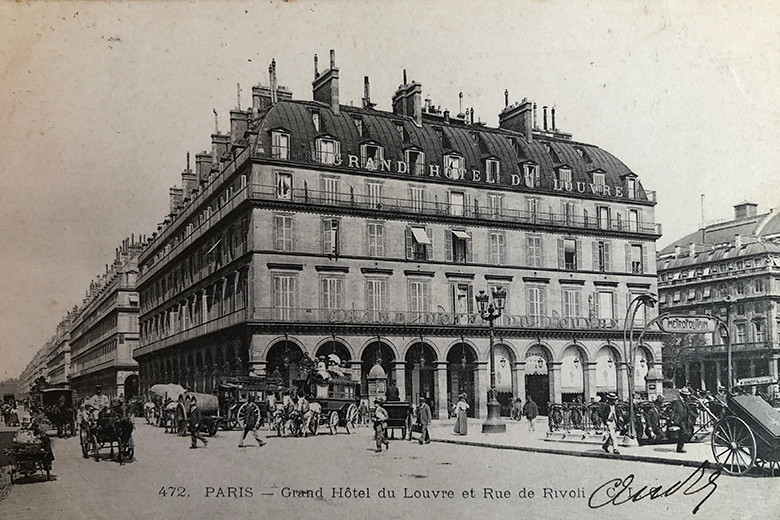 1階のブラッスリーが面する広場の向かいに見えるのは、アンティケール・デュ・ルーヴルの建物。ホテルが1855年にオープンしたのはこの建物内だったのが、全館がブティックとなることになったため、1888年にホテルの別館だった現在の場所に広場を飛び越えて移転したのだ。その結果、角地ゆえにオテル・デュ・ルーヴルは オペラ座、コメディ・フランセーズ、ルーヴル宮、パレ・ロワイヤルという、窓から素晴らしい眺めが得られることに。パリの心臓部に建つ美しいホテル。カミーユ・ピサロに限らず、大勢の芸術家たちが集まってきた。作曲家のワーグナー、作家のジュール・ヴェルヌ、エミール・ゾラ、ヴィクトル・ユゴー……コナン・ドイルはホテルのロビーで “シャーロック・ホームズ” を書いたそうだ。シグムンド・フロイトも、1910年に滞在している。