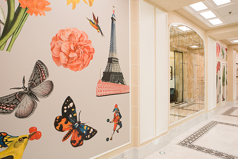 ホテルの通路や客室にポエジーをプラスするのはアーティストのエマニュエル・ピエールによるコラージュ。19世紀の版画や当時の広告ビジュアルなどを切り抜いて、ホテルのためのオリジナル・コラージュを製作した。