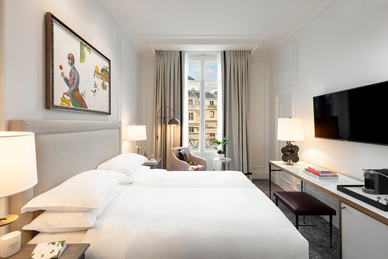 57のスイートを含め、164室の客室のインテリアは比較的シンプル。夜、灯りを消した室内から、外の眺めを絵画のように鑑賞して味わう時間は、オテル・デュ・ルーヴルならでは。パリは初めてというカップルが新婚旅行でここに宿泊したら、ふたりはパリを一生愛し続けることになるに違いない。