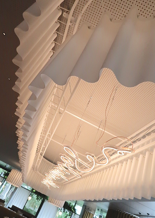 店名のPolichinelleが流線形のネオンで描かれ、レストランの中央を照らす。ポリシネルは即興劇コメディア・デラルテのキャラクターの名前。この命名にはスティーブが彼の妻に贈る愛の物語がこめられている。