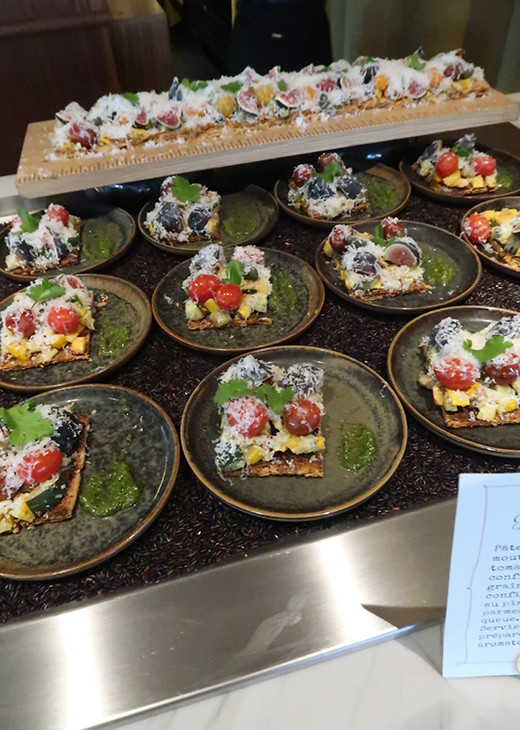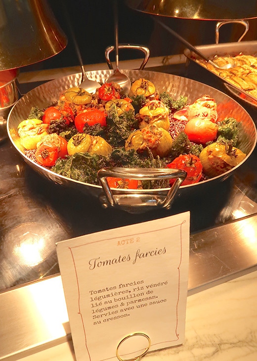 パリは目下ハンバーガーが大ブームである。その火付け役となったビッグ・フェルナンの元オーナーのスティーヴ・ブルグラフが、今度は野菜!!というわけだ。彼がポリシネルをホテルYooma(ユーマ)のレセプション・フロアにオープンしたのには訳がある。このホテルのルーフトップには1600平米という広さの菜園が広がっている。この収穫を活用しない手はないだろう、ということで彼はここに開くレストランを野菜専門にしたのだ。レストランが料理するのは上の菜園で採れる野菜ばかりではないが、いずれにしても食材のすべてがビオ。 キッチンを後ろに隠す劇場風の立派なカーテンの前に長いカウンターがあり、そこに料理がずらりと並ぶ。カラフルな野菜タルト、シーザースサラダ、野菜の天ぷら、トマト・ファルシ、ラタトゥイユ……季節の野菜が素材なので毎月メニューは替わる。たとえばトマト料理はもうじき姿を消して……という具合だ。