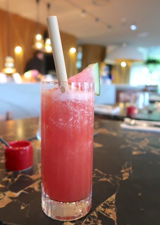 野菜、果物のカクテル(7ユーロ〜)で季節の味を。ストローはプラスチックではなく竹製だ。
