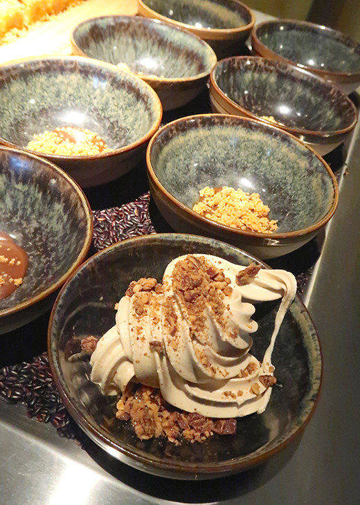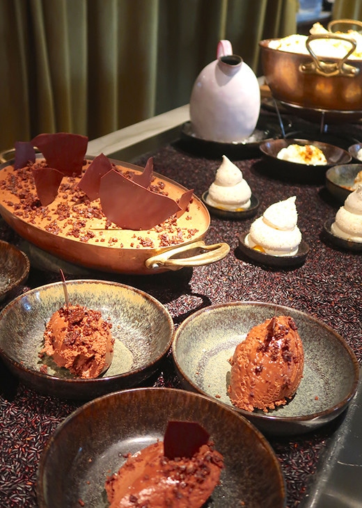 長いカウンターを進んで行くと、デザートのコーナーとなる。甘い誘惑光線を発しているのは、スティーヴと組んでポリシネルの冒険にのりだしたクリストフ・ミシャラックによるパティスリーの数々。野菜嫌いもポリシネルに来れば、野菜が好きになること請け合いだし、最後の甘い締めくくりがうれしくて、野菜を食べにポリシネルにまた足を運ぶことになるだろう。ディナーはビュッフェ(飲み物別39ユーロ)なのでカウンターに並ぶ料理もデザートも、すべてを味わえるチャンス !