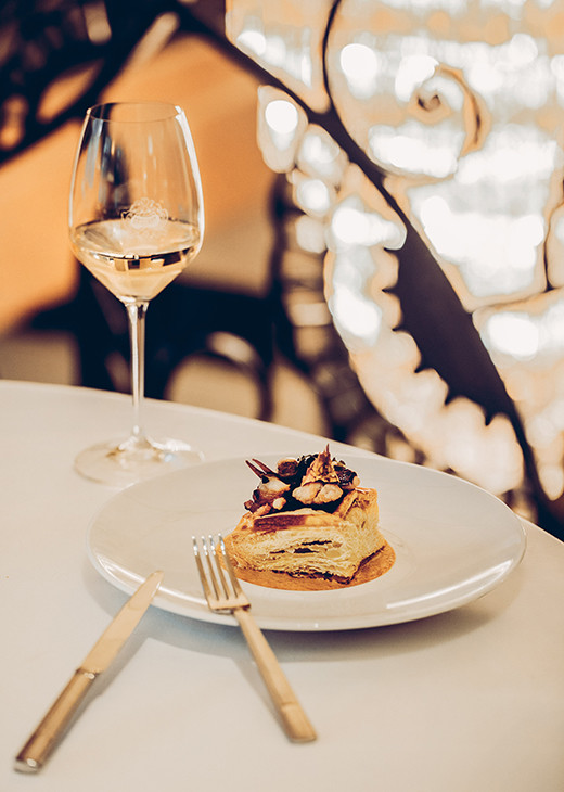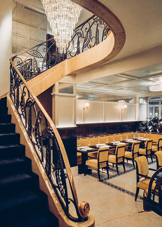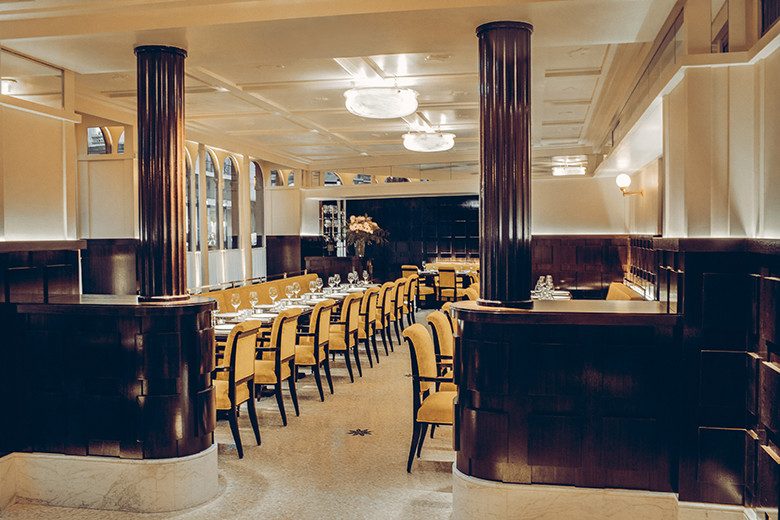 21世紀風アールデコ・スタイルの贅沢な空間。この雰囲気で提案されるランチのセットメニューSt. Augustinは前菜、メイン、デザートで45ユーロ。ディナーのセットメニューGaillonは前菜、メイン、デザートで59ユーロ。どちらもメインは肉か魚のチョイスがある。©Matthieu Salvaing