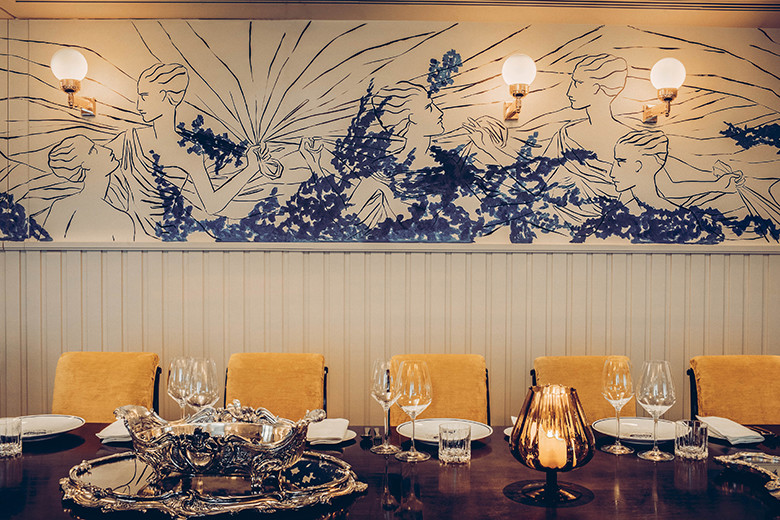 マルセル・プルーストは1919年に『花咲く乙女たちのかげに』でゴンクール賞を受賞している。なぜか以前はサロン・ロダンと命名されていたが、改装を機にサロン・プルーストと改名された。壁画は彼の受賞作のタイトルにインスパイアされたもの。©Matthieu Salvaging
