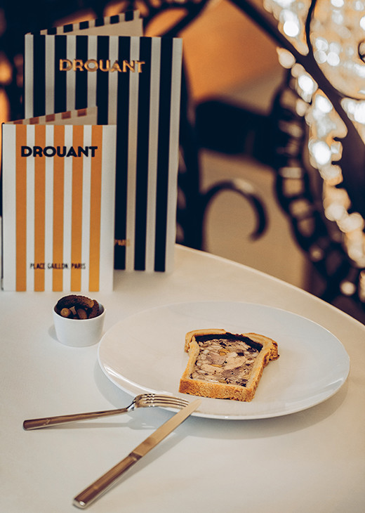 アラカルトの前菜から、「3種の肉のパイ包みパテ」19ユーロ。メニューのグラフィックやロゴを担当したのはフランク・デュランだ。©Matthieu Salvaing