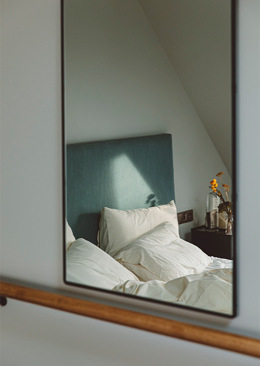 23室の客室。オーナー自身が手がけたインテリアには木やラフィアといった自然素材を用い、オーガニックのペイントで塗られた静かな色の壁には手仕事によるムラが生かされている。おもしろいことにテレビが客室に備えられず、その代わりにストレッチ用のバーが備えられ、またパリの水を備長炭で浄化して飲めるようにという配慮も。部屋に置かれたiPhone用のスピーカーは、メカを搭載していないシンプルな陶製である。
