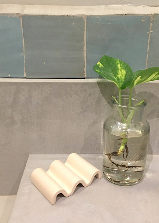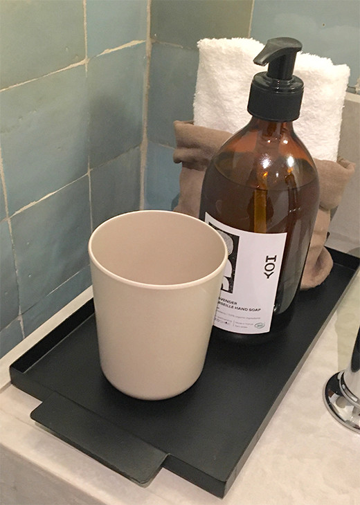 バスルーム内、竹製のカップ、陶製の歯ブラシレスト……ノープラスチックを実践。
