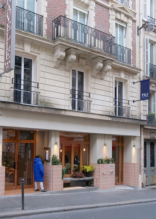 スイーツの店が軒を連ねるマルティール通りにあるオイ・パリ。ヨガ教室YUJの看板が目印だ。