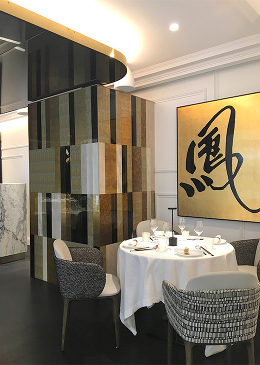 ランチ用のスペースは入口から入って右手にある。ここでは点心メニューがあるので、ひとりでもいろいろ味わえるのがうれしい。デザートまで5品で48ユーロあるいは70ユーロの2タイプがあり、どちらも各料理にワインをセットすることも可能だ(88ユーロ、110ユーロ)。あれこれおいしい料理を楽しみたいという時、点心メニューは心強い味方では?