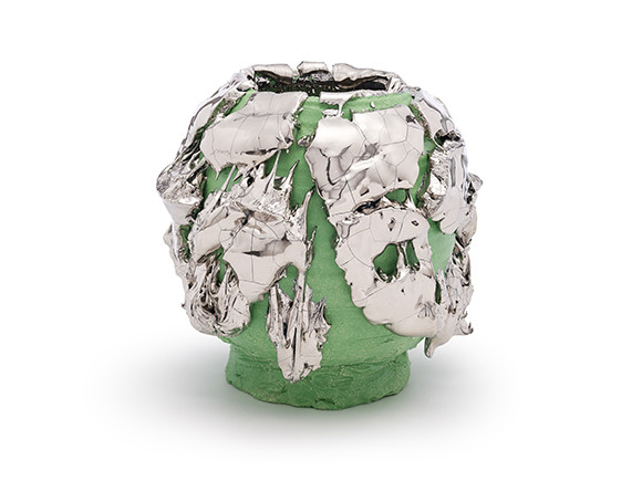 桑田卓郎の「Tea Bowl」(2017)。器から流れ出すようなプラチナの躍動感が見る者を圧倒する。