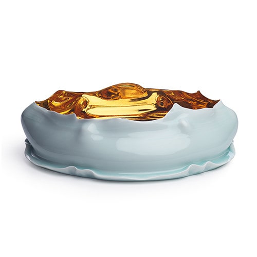 北益子をベースとする安田猛による「Qingbai Gold Bowl」(2015)。まろやかな色とかたちの磁器の内側には、きらびやかなゴールドが。そのコントラストにはっとさせられる。