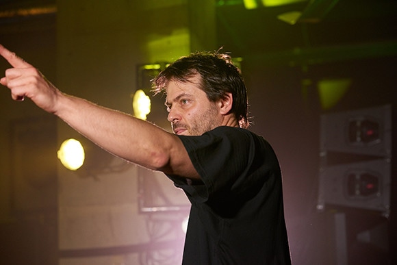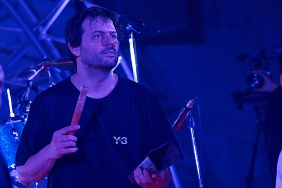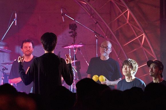 コンダクターを担当するシシド・カフカ。左から、サンティアゴ・バスケス、シシド、芳垣安洋、茂木欣一、金子ノブアキ。