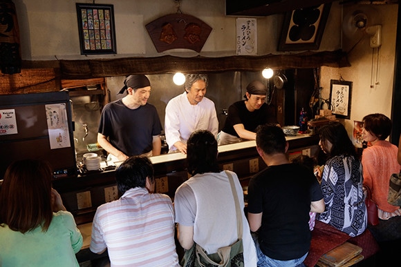 真人の父を演じる伊原剛志(左)と母のメイリアン役を演じるジネット・アウ(右)。このシーンが撮影されたのが敬介氏のラーメン店だ。