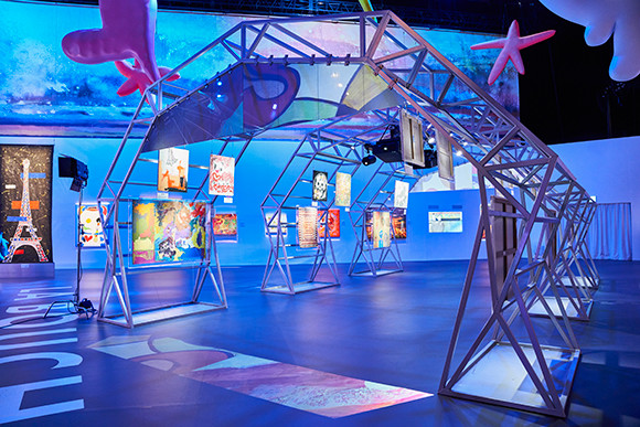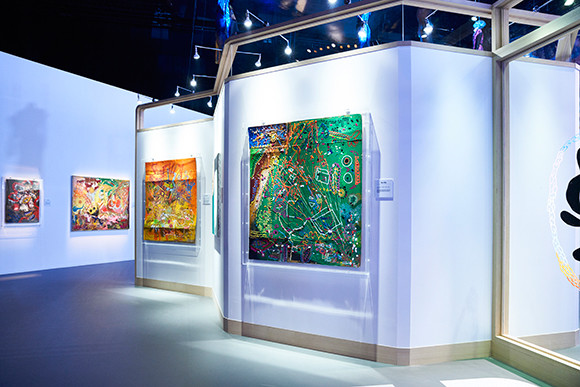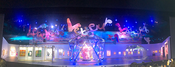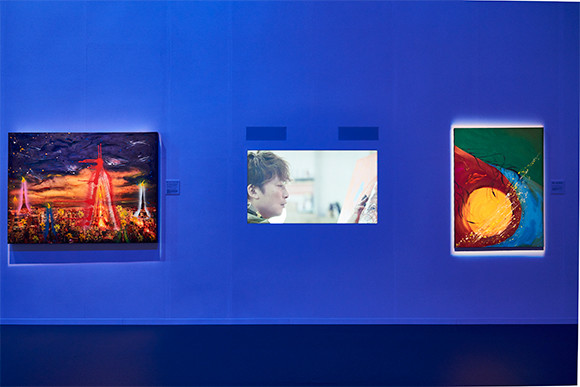 その映像を鑑賞し、心地よい衝撃を受けた後にステージ上へ移動する。そしてそこに並べられた絵画やオブジェ、製作シーンを捉えた映像などを鑑賞し、3つに分かれた展示ゾーンを順に回遊していくという流れ。