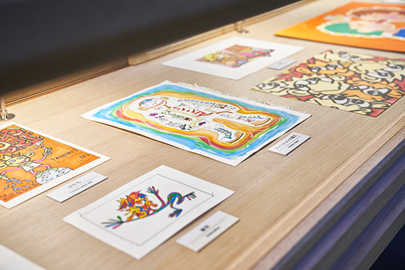 「絵を描き始めた頃には、段ボールに描いていた」と香取。その時代の作品も並ぶ。