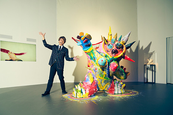 カラフルにペイントされた新作オブジェ『SPACE DANCE』の前で。