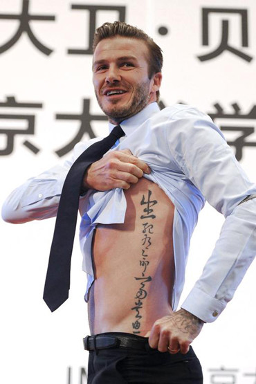 孔子の教え「生死有命 富貴由天」を刻んだ中国語のタトゥーを誇らしげに見せるデヴィッド・ベッカム。photo:Getty Images