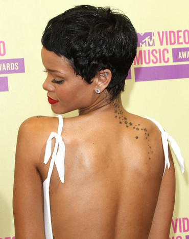 たった7年間で、身体中に21個ものタトゥーを入れたリアーナ。ニューヨークのタトゥーアーティスト、Bang Bangが手がけた銀河のタトゥー(写真)をはじめ、胸の下のエジプトの女神イシス、首の「Rebelle fleur」の文字が有名だ。どうやら彼女も、第一外国語でフランス語を選択しなかったようだ。photo:Getty Images