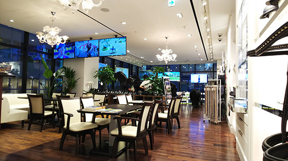 スタジオは、銀座一丁目駅直結という抜群のアクセス。レッスン後には、このラウンジでオリジナルブレンドのおいしいコーヒーも味わえる。