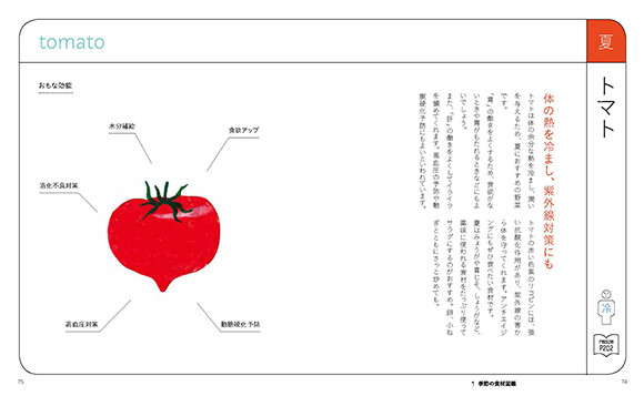 季節ごとに旬の素材をイラストとともに解説。イラスト脇にはそれぞれ効能が表記され一目で分かりやすくなっている。