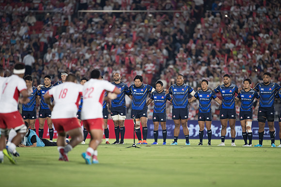 ハカを受ける日本代表。トンガ戦ではブルーのセカンドジャージーで登場。
