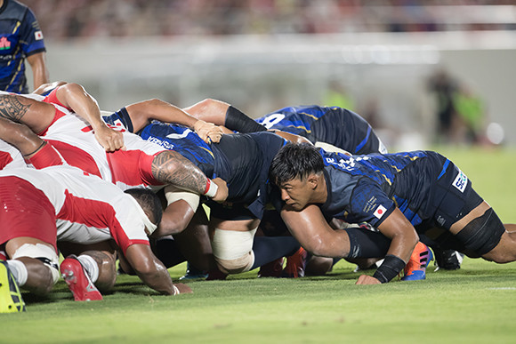 スクラムを組む日本代表、手前はフランカー(FW)の徳永祥尭(東芝)。