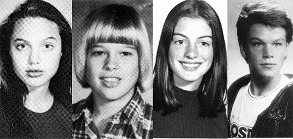 高校時代の写真。左からアンジェリーナ・ジョリー、ブラッド・ピット、アン・ハサウェイ、マット・デイモン。photos:Getty Images and Abaca