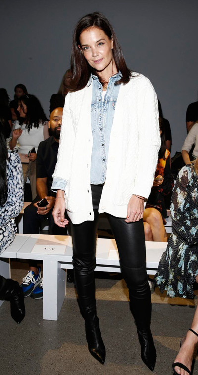 9月に入ってすぐ、ウールのカーディガンに同色のブラジャーを合わせたコーディネートでメディアを賑わせたばかりのケイティ・ホームズ。ニューヨーク・ファッションウィーク公式開幕前日の9月5日に行われたエリー タハリのショー最前列に登場し、ここでもファッショニスタぶりをアピールした。この日の彼女はデニムのシャツとレザー風パンツというさりげない装い。今シーズンのニューヨーク・ファッションウィークの気分はシンプルスタイルかと思いきや、翌日さっそく、やんちゃなジェレミー・スコットのショーで予想は覆された。
