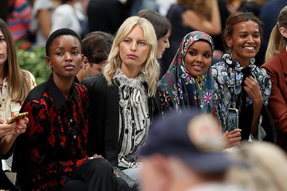 トリー バーチのショー最前列を飾った、フラワープリントの服を纏った4人。左からフラヴィアナ・マタタ、カロリナ・クルコヴァ、ハリマ・アデン、リヤ・ケベデ。(アメリカ・ニューヨーク、2019年9月8日)Photo: Photo press