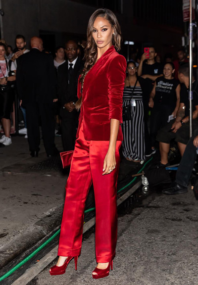 トップモデルのジョアン・スモールズは真っ赤なタキシード。こちらも見事な着こなし。(アメリカ・ニューヨーク、2019年9月10日)Photo: Getty Images