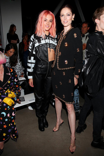 蛍光カラーのウィッグが続々と登場するジェレミー・スコットのショーでは、歌手のシャーロット・ローレンス(左)がランウェイにも引けを取らないヘアを披露。モデルのココ・ロシャ(右)と並んでフロントロウを飾った。(アメリカ・ニューヨーク、2019年9月6日)Photo: Getty Images