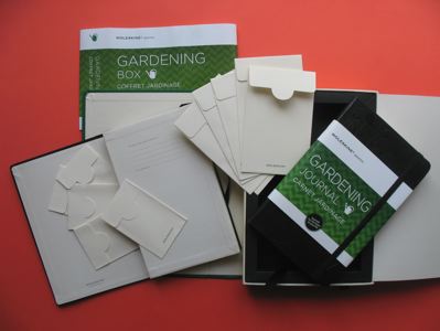 ガーデニングジャーナルとガーデニングポケットがセットになった「ガーデニング ボックス」。6つに仕切られた収納用コンパートメントのガーデニングポケットの中には、種を集めたり、交換できる種入れ封筒がそれぞれ6枚ずつ入っている。¥6,993