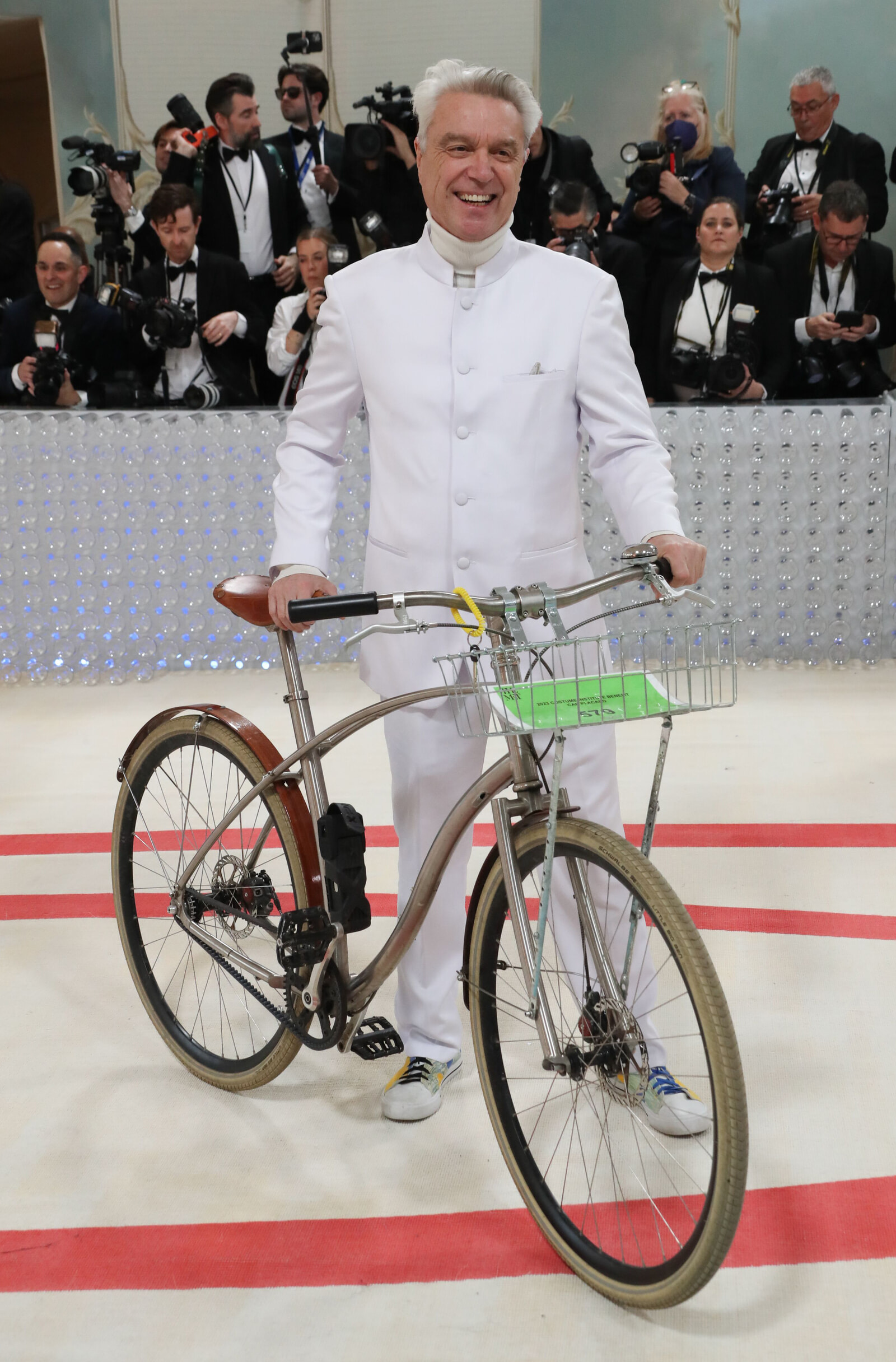 映画『ラストエンペラー』でアカデミー賞作曲賞を獲得したデヴィッド・バーンは、普段乗っている自転車で来場する斬新なスタイル。白髪にホワイトスーツがお似合い。