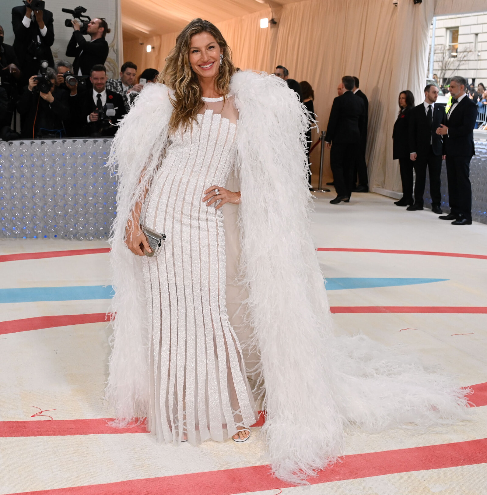 長年ヴィクシーの専属モデルを務めていたジゼル・ブンチェン。ヴィクシーのショーでモデルたちが着けていた巨大なウィングを彷彿とさせる、フェザーのケープを羽織った純白のドレスアップ。